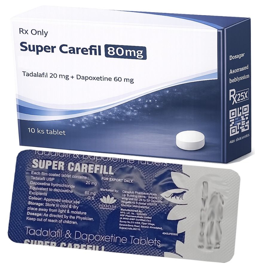 Super Carefill 80mg je vylepšený generický Cialis 20mg o 60mg Dapoxetine, teda ako dva lieky v jednej tablete. Dapoxetine je už dlho účinným liekom predčasnej ejakulácie a lepšej kontroly nad predčasnou ejakuláciou. Super Carefill 80mg úspešne lieči impotenciu a problémy s erekciou (erektilnej dysfunkcii) a po jeho užití je umožnené skoro každému mužovi dosiahnuť veľmi kvalitné a dlhotrvajúce erekcie a užiť si tak lepšie a dlhší sexuálny styk.